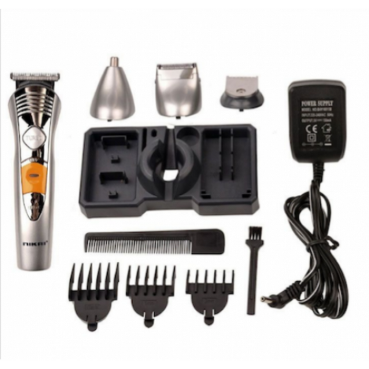 Aparat cu capete detasabile, marimi de tuns, adaptor nas si urechi, masina barbierit, trimmer de barba si mustati. Aparat de tuns fara fir cu acumulator, adaptor de incarcare la priza. Pana la 40 de minute timp de utilizare fara fir.