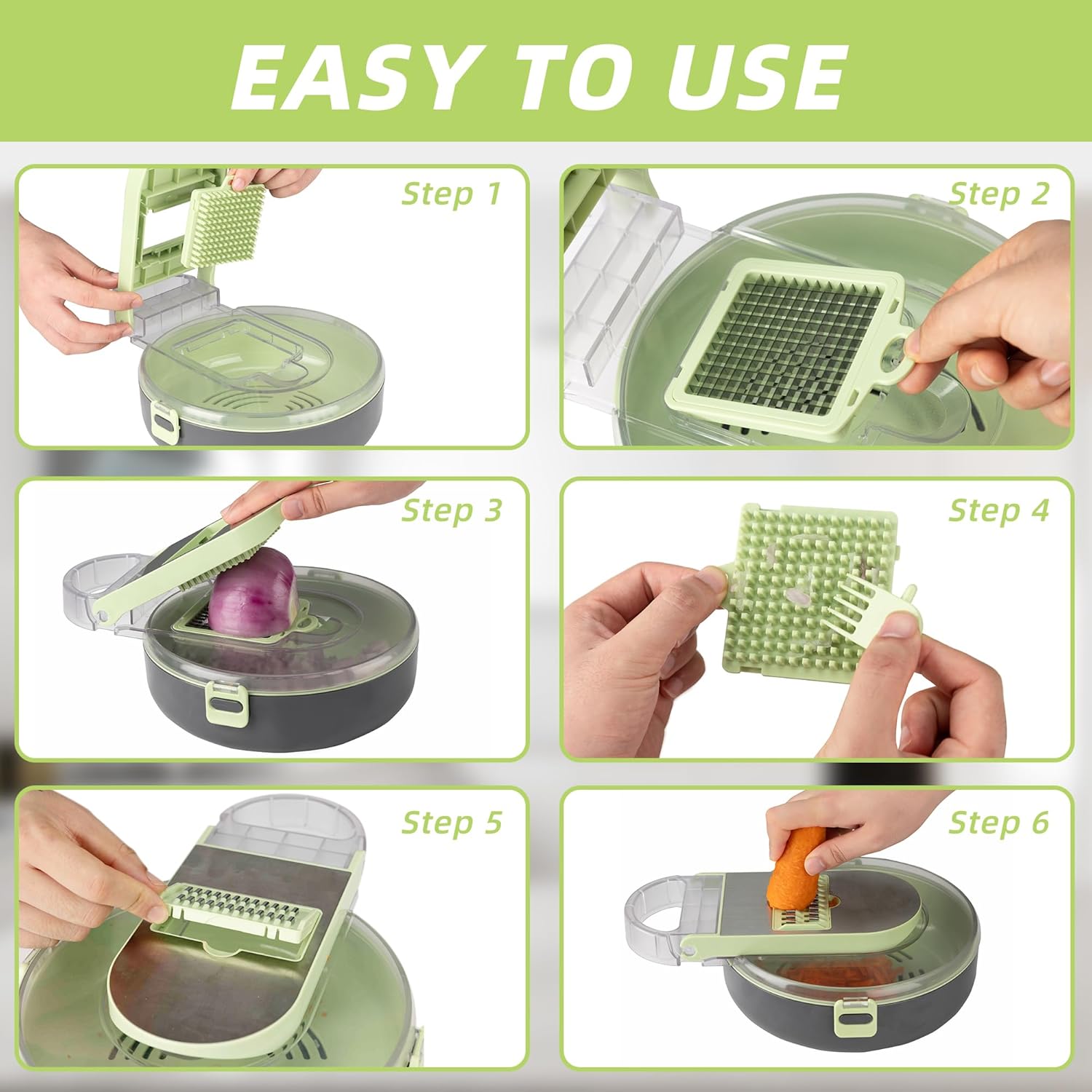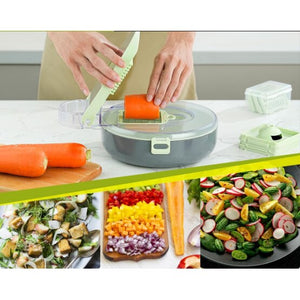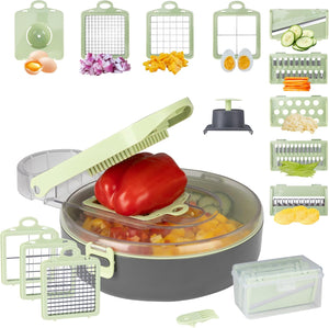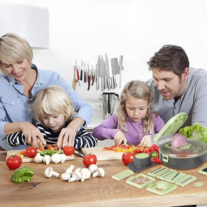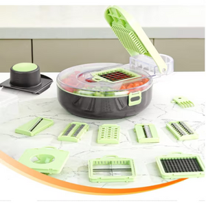 Tocătorul de legume oferă multiple moduri de feliere, având 9 lame interschimbabile și un protector pentru mâini, prevenind accidentările. Permite atât mărunțirea, cât și felierea ingredientelor. În plus, este echipat cu un tocător de usturoi și un separator de albușuri, satisfăcând toate nevoile din bucătărie.
