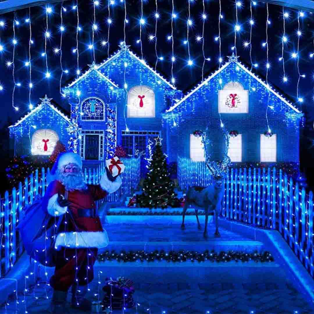 Instalatie Craciun 12 metri franjuri cu led-uri albastre. Instalatiile sunt tip perdea luminoasa cu franjuri inegali. Instalatia de Craciun poate fi utilizata atat in spatii de interior cat si la exterior, protejata de intemperii.