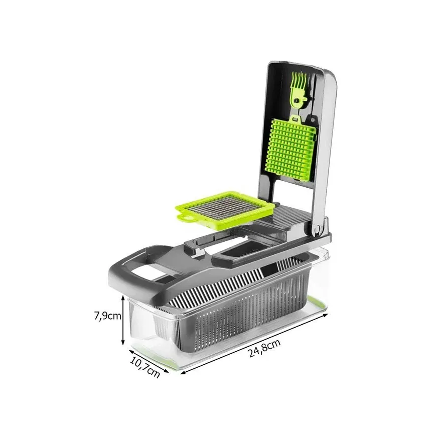 Tocatorul de ceapa include un cos de scurgere si un recipient mare, astfel incat sa puteti spala legumele si fructele direct dupa taiere si feliere.