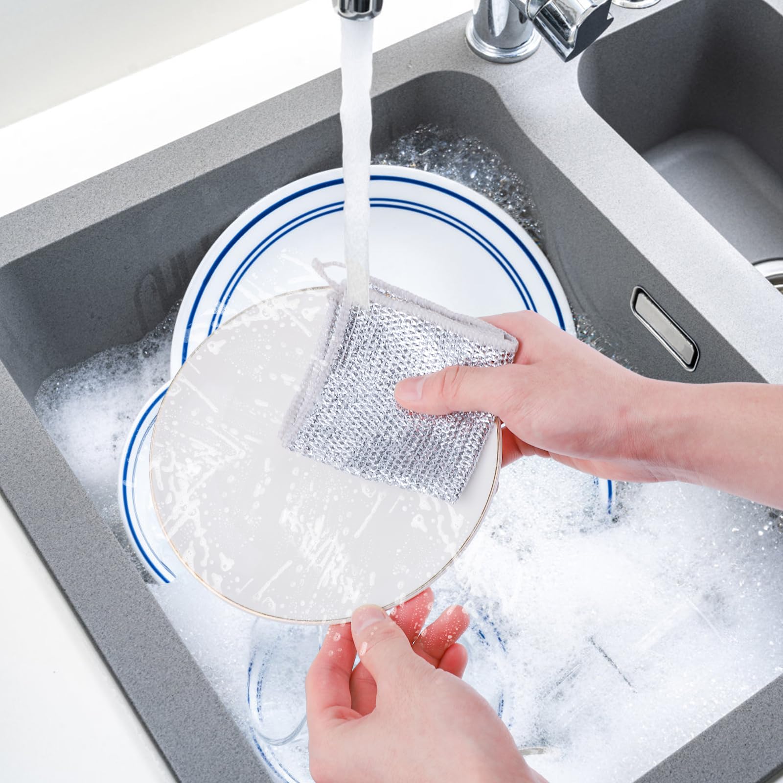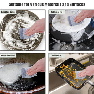 💪 Lavetele sunt fabricate dintr-un material metalic durabil, cu dublu strat, ce le face rezistente la uzură și perfecte pentru utilizări repetate. Sunt suficient de puternice pentru a elimina grăsimea și resturile arse, dar suficient de delicate pentru a proteja vasele antiaderente și suprafețele sensibile.