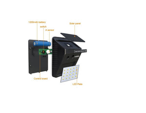 Lampa solara de perete 20 leduri foarte puternice Se incarca la lumina naturala Datorita senzorului de lumina si cel de prezenta , functioneaza numai pe intuneric si in momentul in care sesizeaza miscarea! Buton ON/OFF (buton de oprire generala) . PANOU SOLAR : 0.55W Baterie Li-ION : 3.7V , 1200 mAH Unghi de detectie 120 grade Distanta de detectie 3-4m (in functie de conditii si montaj) Delay : 10 secunde Dimensiuni: 124x 95x 47 mm Pachetul contine: *lampa completa cu panou sola *surub si diblu *manual *cutie de prezentare Avantaje Lampa: - nu mai este nevoie de baterii - il puteti instala in cateva secunde - il puteti monta pe aproape pe orice suprafata: caramida, plastic, metal, lemn, sticla etc - durabil - functioneaza pe orice vreme - fara cabluri
