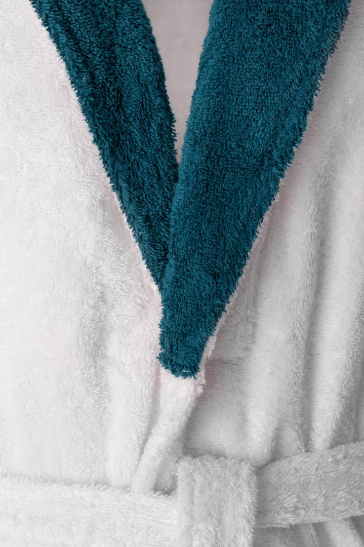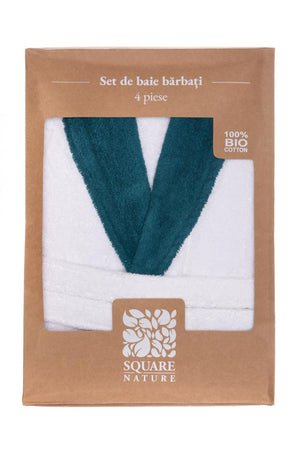 Set de baie Barbati BBC Organic 4 piese. Setul contine : un halat de baie barbati alb cu guler colorat albastru petrol, marime universala + un prosop de fata 30×50 cm + un prosop de baie 70×140 cm + papuci de baie. Material : 100% Bumbac Organic , densitate 550 GSM